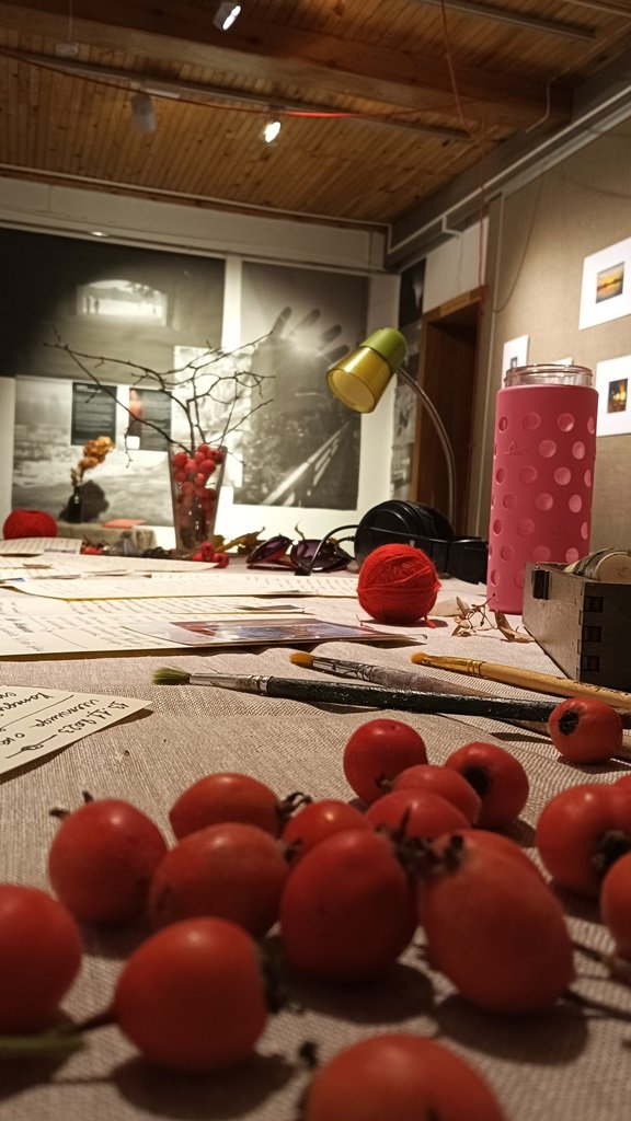 В камерном пространстве, напоминающем мастерскую, тактильные этюды-впечатления, архивные артефакты и дневниковые записи сплетаются в единую «кудéль» — первичный материал памяти и опыта. Красная нить, связующая прошлое с настоящим, более не линейна: она образует сложные переплетения, подобные нейронным связям или корневой системе.