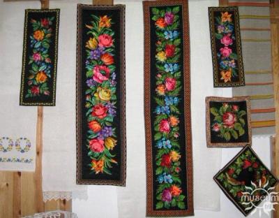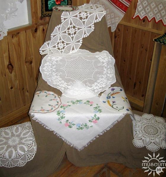 На выставке представлены работы вышивания ришелье, гладью вручную и на машине; вязаные крючком филейные и ирландские кружева; тканые ручники, покрывала и подузорники; вышитые крестом салфетки и панно.